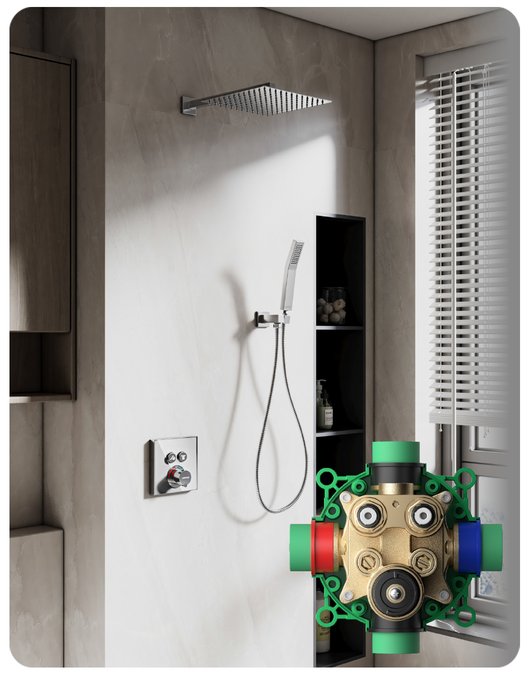 節(jié)省空間,極致簡(jiǎn)潔:所有管道、閥體均預(yù)埋入墻,只留下精致的花灑頭和簡(jiǎn)潔的控制面板裸露在外。浴室墻面瞬間變得清爽、開(kāi)闊,毫無(wú)累贅,彰顯高級(jí)簡(jiǎn)約風(fēng)范。